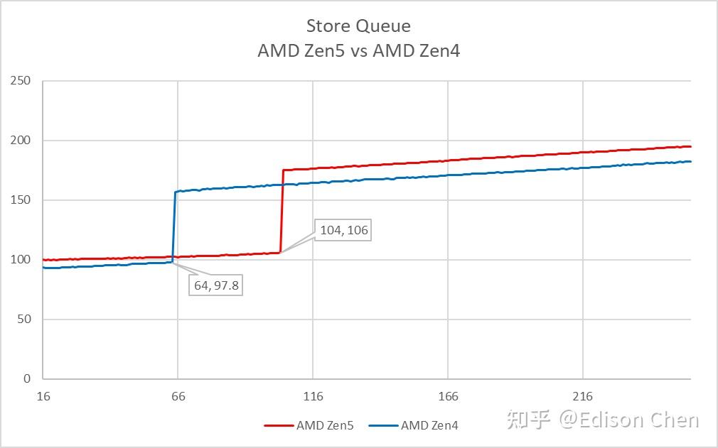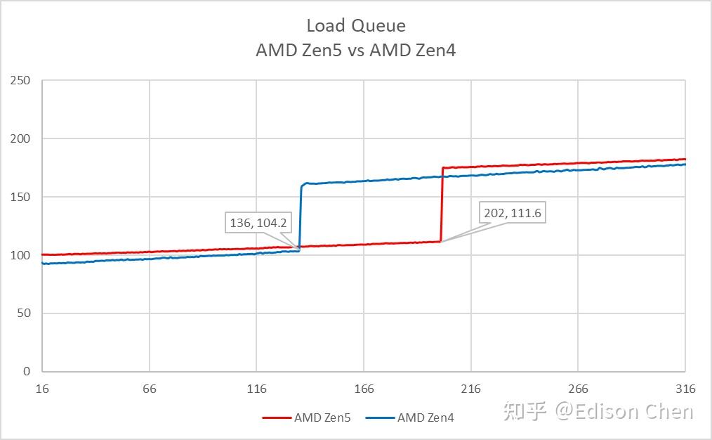 LSQ 实测方面,Load Queue 为 202 项,Store Queue 为 104,AMD 并未提供相关细节。