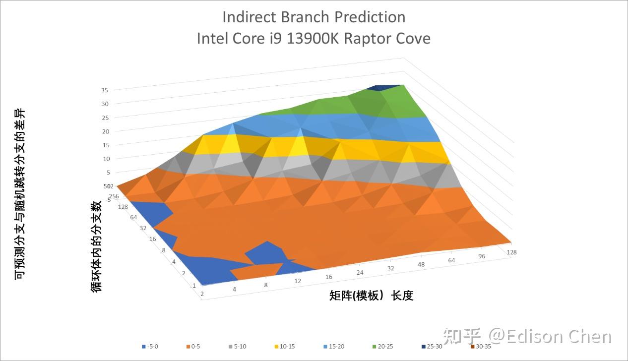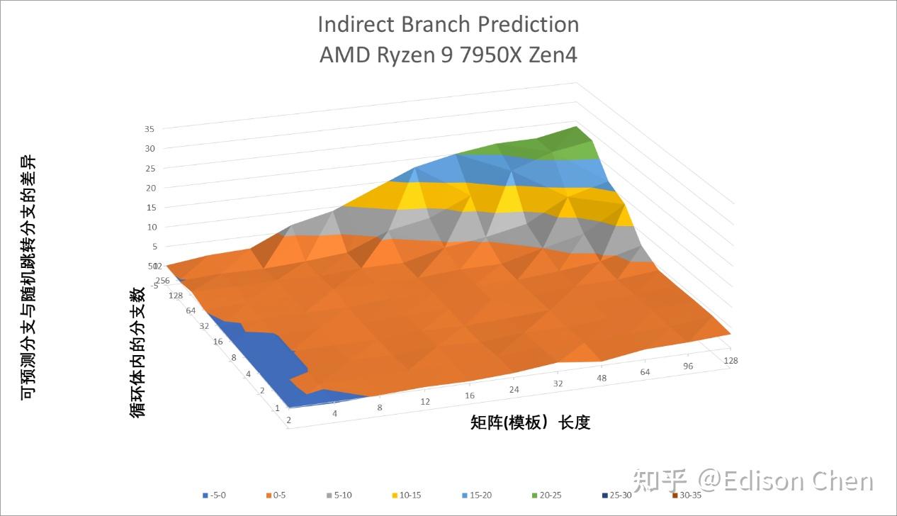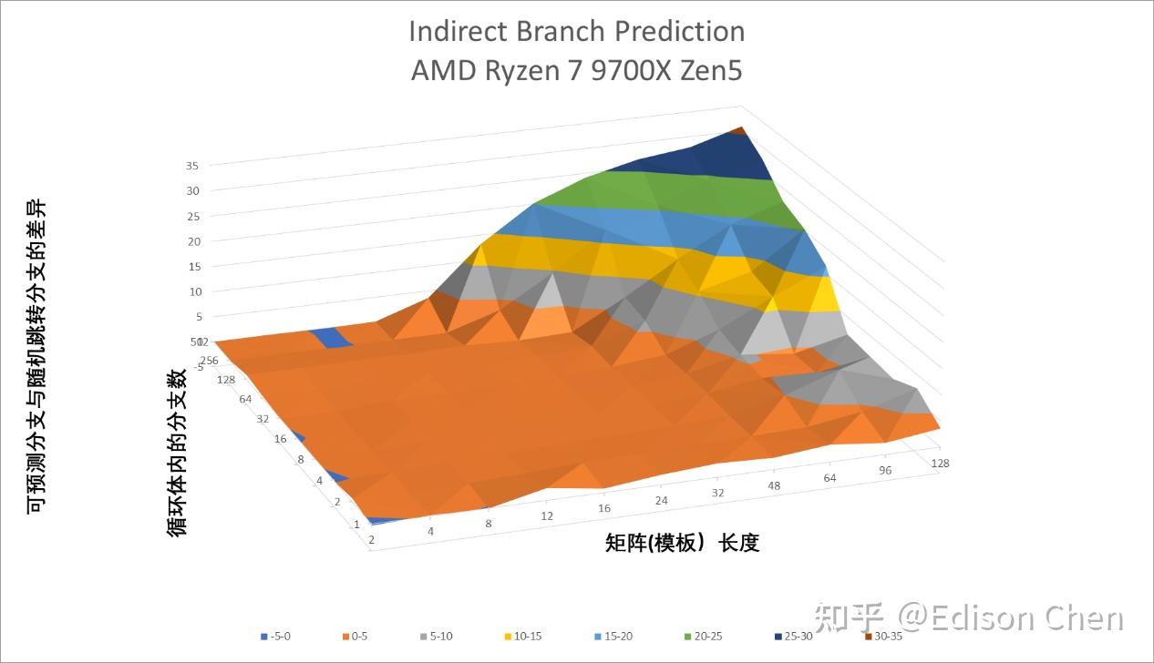 整体而言,AMD Zen5 具有比 Zen4 更出色的间接预测能力,曲面图的地平坦度(代表了成功预测的分支数)比 Zen4 好不少,不过相对的如果预测失败其受到惩罚要高(陡峭)不少。