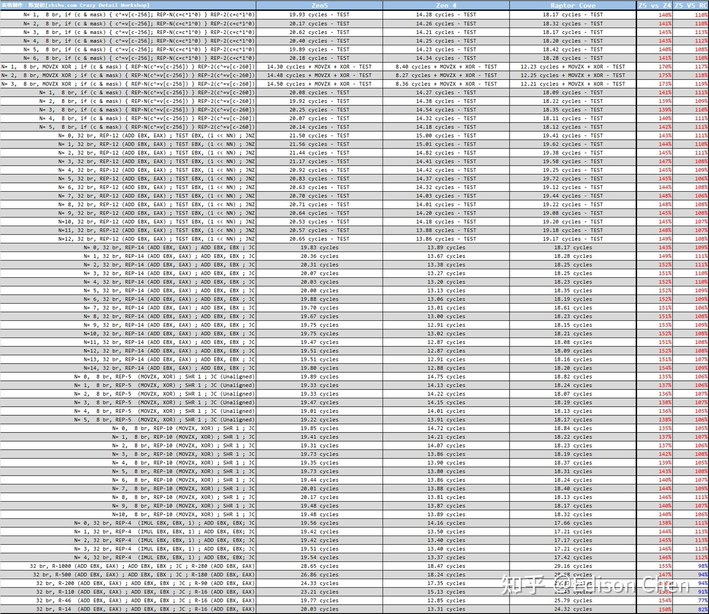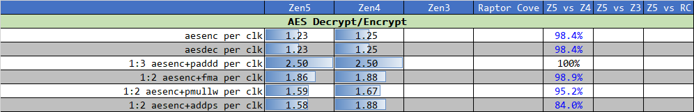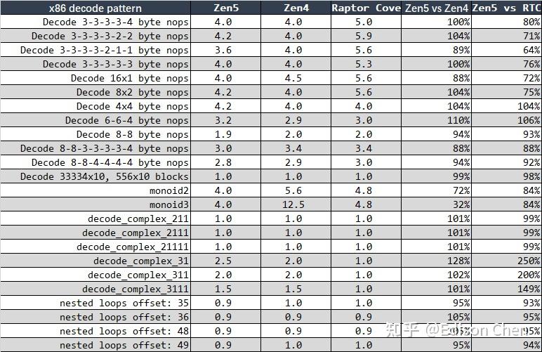 上表中的解码能力测试是当年 Travis 为了测试 Alexander Monakov 提出的 SKL 具备每周期 5 条 16 字节指令解码能力,但却因为重命名工位限制为每周期 4 指令的想法而设计的,原结果是 CPI(每指令周期数),这里我已经将测试结果转换为 IPC。从上面这个表格的测试结果看,Zen4 在 monoid3 的时候 IPC 可以达到 3.125 倍于 Zen5,但是复杂指令 3-1-1 模板里,Zen5 是 Zen4 的 1.25 倍。Raptor Cove 在较短的 x86 指令解码上更有优势,而在复杂指令模板下有时候只有 Zen5 的 40% 到 50%。