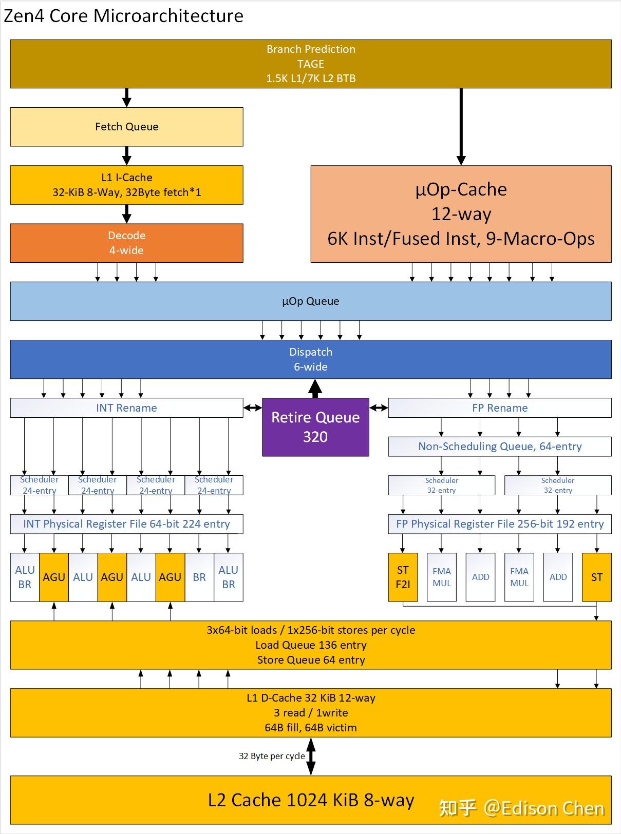 上面这两张图分别是 Zen4 和 Zen5 的架构图,基本按照 AMD 提供的资料绘制,从整体上来看,Zen5 和 Zen4 相比有很大变化,无论是前端、后端。
