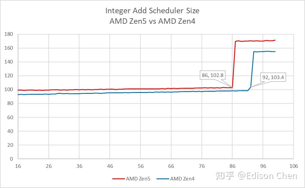 整数调度器方面,Zen5 实测值为 86,略低于 AMD 提供的 88,差别不大,这可能是因为一些额外的开销或者架构状态占用。