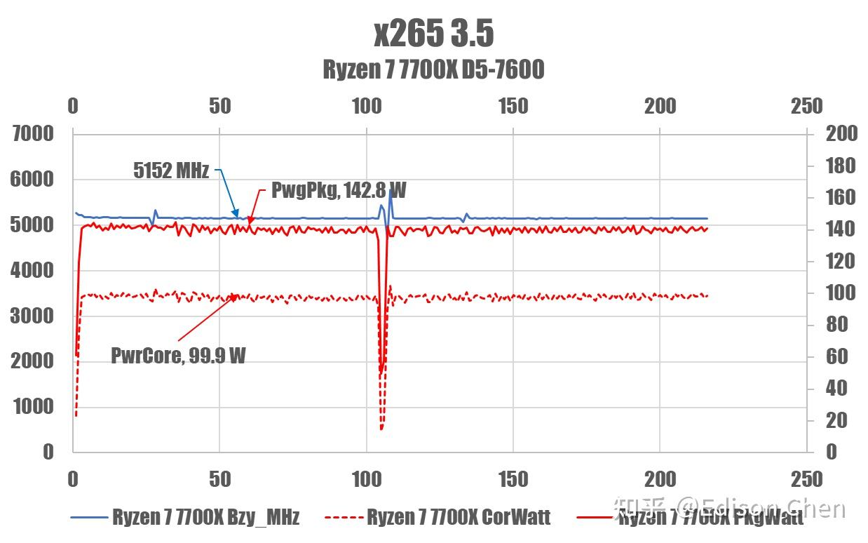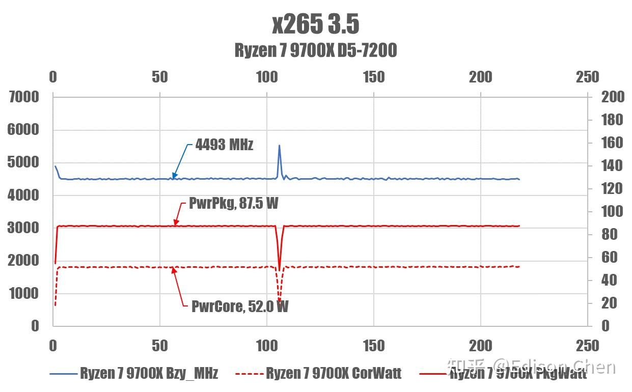 正如大家所看到的,Ryzen X7 9700X 在运行 x265 的时候,全片功率已经达到了 TDP*1.35 的 PPT 上限(87.X 瓦),此时频率降低到了 4493 MHz。