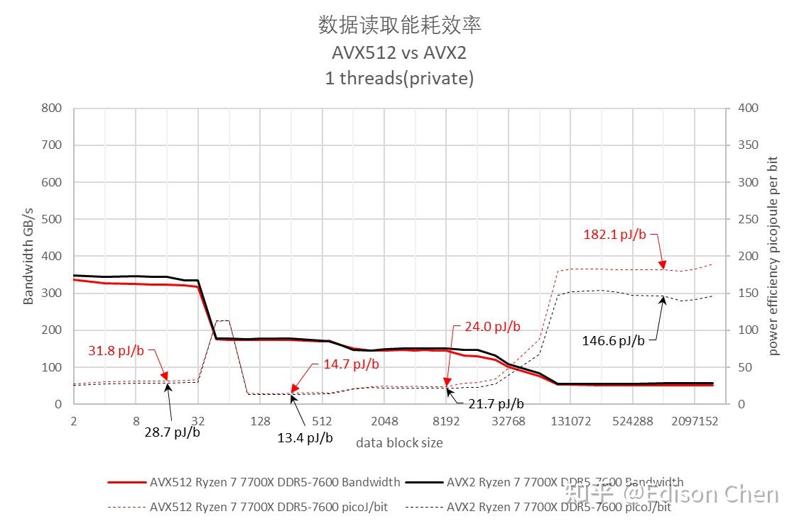 在能耗方面,在 L1D Cache 内的话,AVX512 时的能耗比为每 bit 6.8 皮焦耳(比 7700X 降低 78.6%),AVX2 为 25.6 皮焦耳(比 7700X 降低 10.8%);