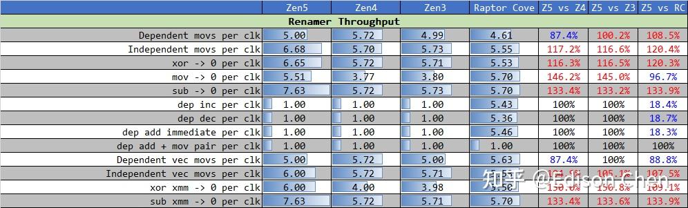 从测试结果来看,相依性的 mov 指令 Zen5 会比 Zen4 低一些,但是在不相依的时候,IPC 从 5 提升到了 6.7(提升了 34%),这说明 Zen5 在重命名工位的资源能比较好的支撑流水线后端更强的访存单元。