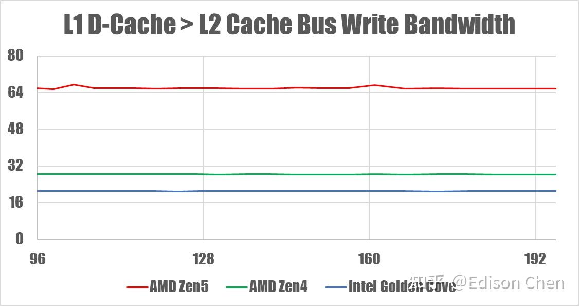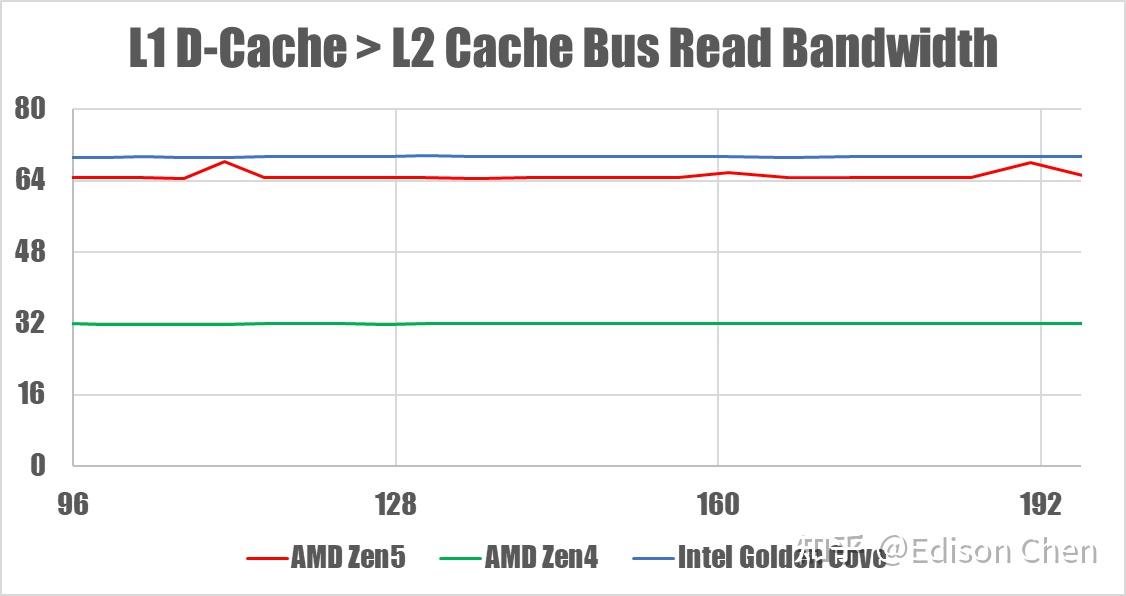 在 L1-L2 总线方面,Zen5 都提供了 512-bit 读写能力,Zen4 是 256-bit,Intel Golden Cove 的读取为 512-bit、写入是等效 168-bit。