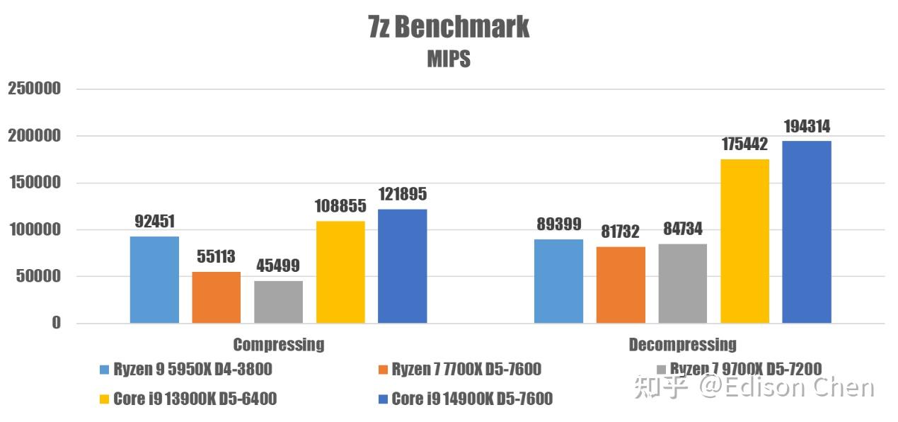 更深的流水线——等效 20 级,Zen4 则是相当于等效 14 级,额外的流水线深度意味着分支预测缺失造成的惩罚会严重不少,则在 7z 测试中有所体现。