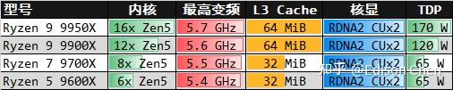 目前发布的 Zen5 桌面产品有 4 个型号,分别是 Ryzen 9 9950X、Ryzen 9 9900X、Ryzen 7 9700X、Ryzen 5 9600X,规格如下: