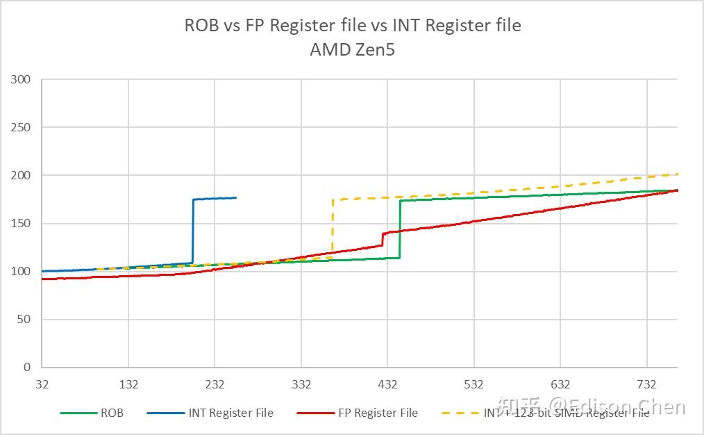 在乱序执行资源方面,Zen5 的浮点和向量寄存器堆有巨幅的增长,而整数寄存器堆实测基本一样(本文所有测试数据都是关闭超线程下录得的,超线程数据还没整理好)。
