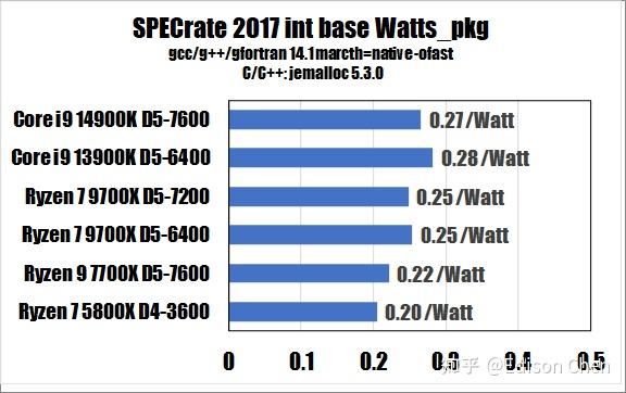 Ryzen 7 9700X 每瓦特得分是 0.36,Ryzen 7 7700X 每瓦特得分是 0.29。