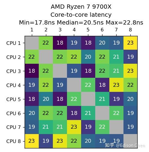 从测试结果来看,单 CCD 的 Ryzen 7 9700X 核间时延要比 Ryzen 7 7700X 略高。