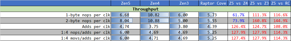 和 Zen4 相比,Zen5 的 ROB “放弃”了 NOP 合并的功能,这使得 Zen5 在 ROB 和解码测试中跑 NOP 指令吞吐有时候看上去不如 Zen4。