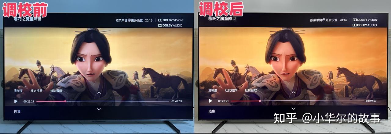 同时,《哪吒之魔童降世》里傍晚的一个片段,在未开启调校前,画面会偏白;但在开启调校后,补足了色彩,无论是天空还是人物,都刻画得更加真实、生动,沉浸感拉满。