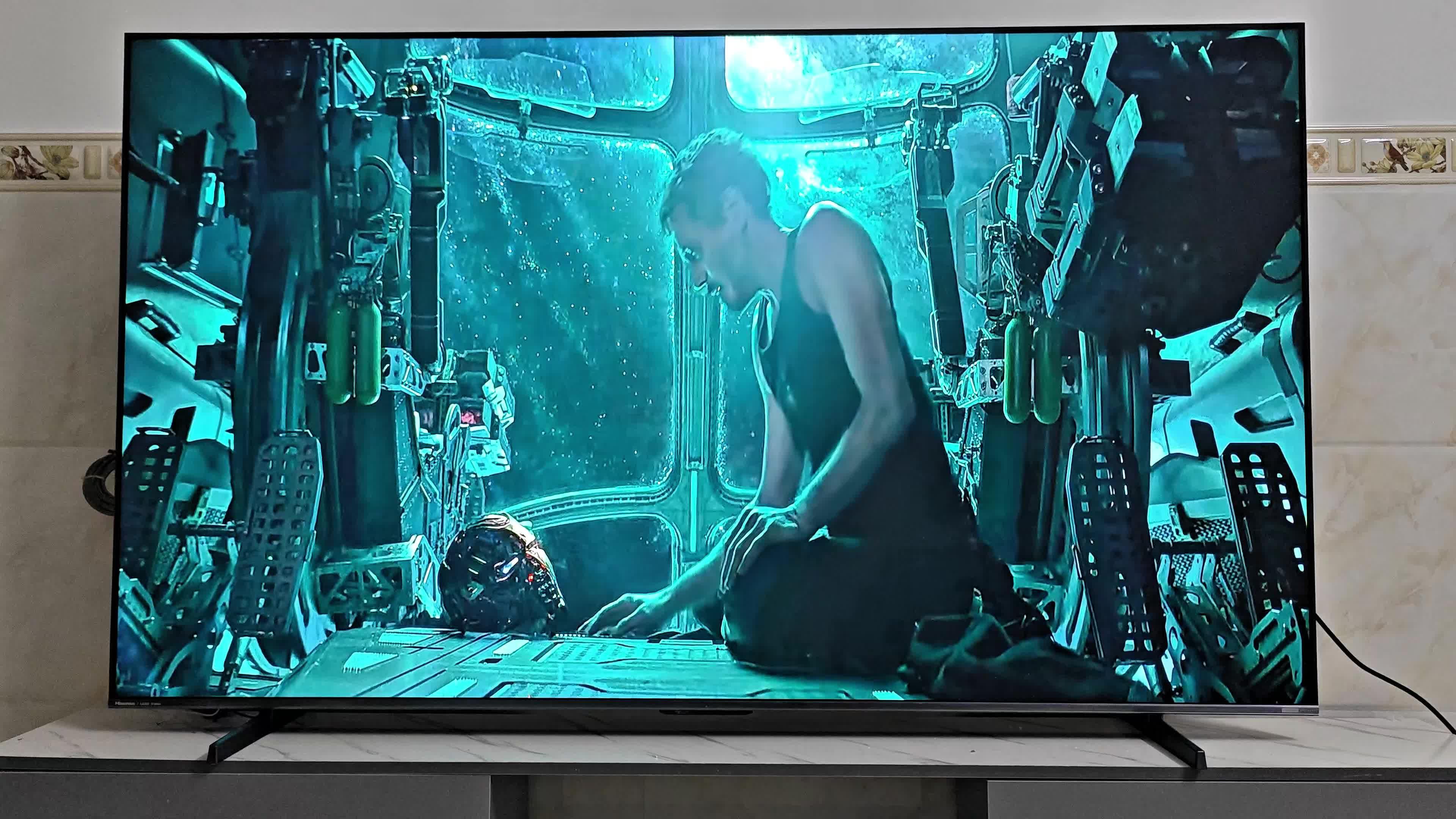 下面是我在强光线下播放了《复仇者联盟4》中比较暗的场景,可以看出画面并不会受光线的影响,即使在强光线下,小墨E5Q PRO仍然能够保持清晰的画面,丝毫没有倒影或发灰发暗的问题。