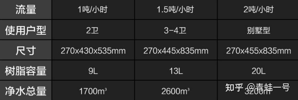 9L树脂含量,软水交换量大,可同时满足多个用水点供水,选择哪个流量及树脂含量可以参考上图,对应户型选择即可。