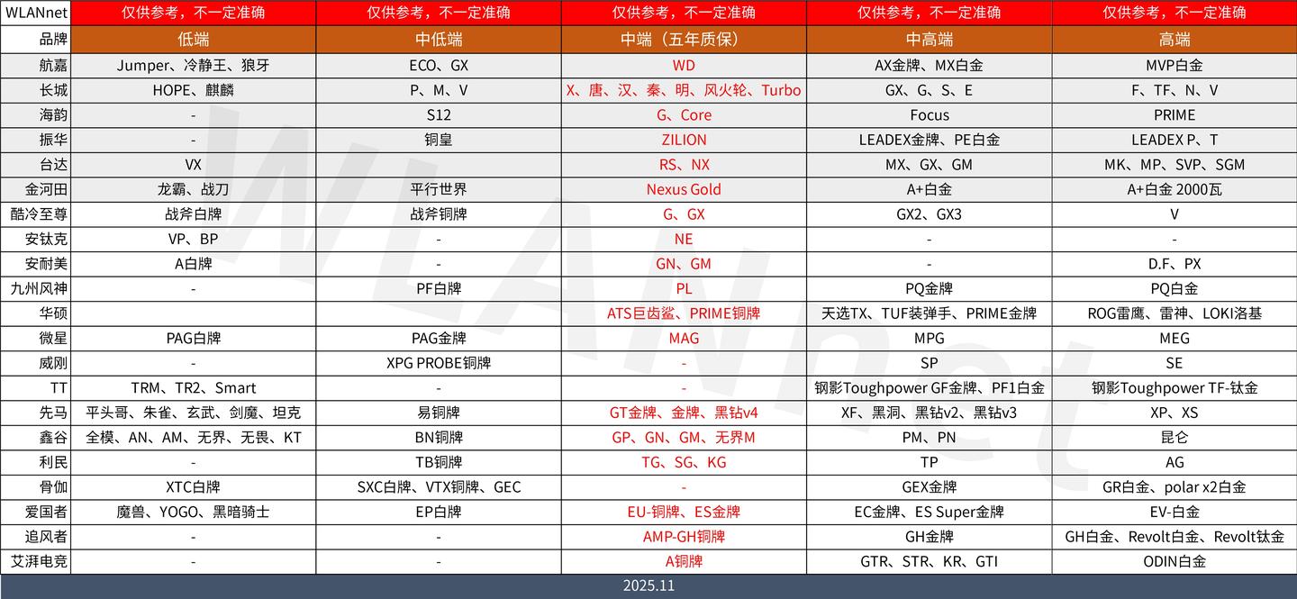 4. 部分品牌的电源等级分类: