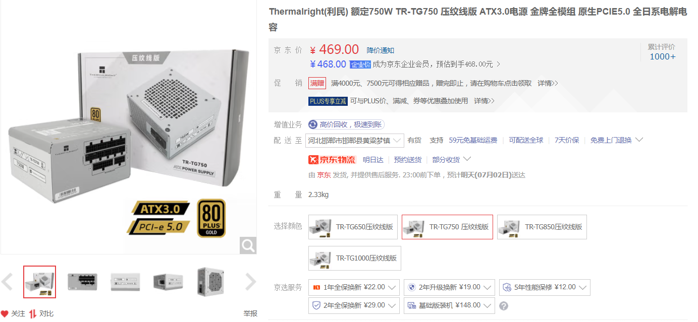 TT中高端产品,七年质保+全日系电容,用的压纹线。符合ATX3.0标准,也有12V-2×6口。