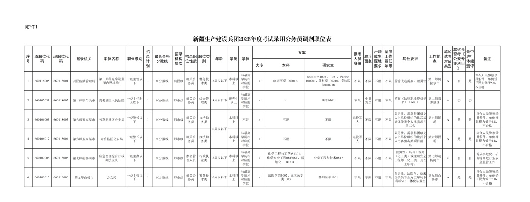 报考者可在本页下载《2026年兵团考试录用公务员调剂职位表》(附件1),查询调剂职位、调剂人数、考试类别、资格条件等。