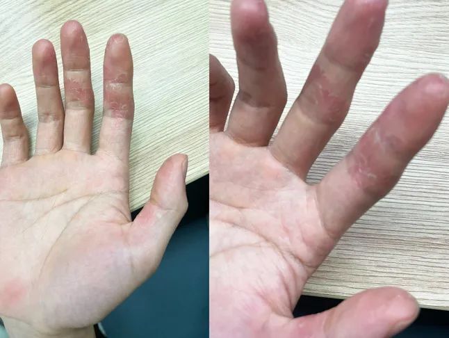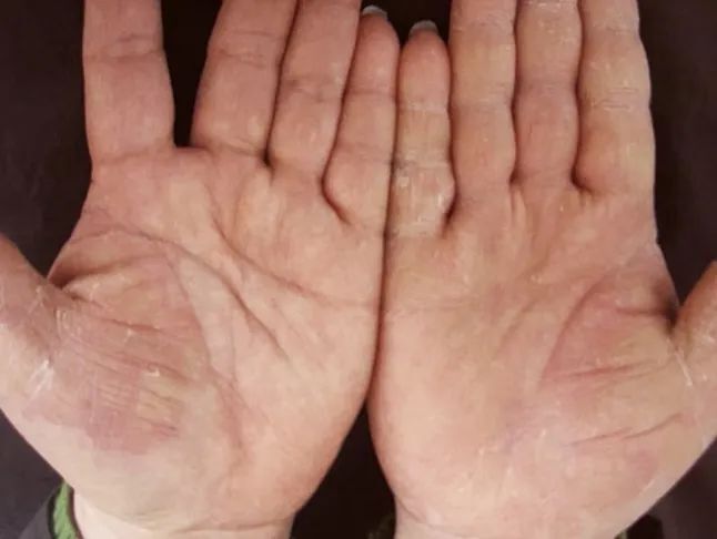 其可表现为红斑、丘疹、脱皮、水疱、皮肤增厚苔癣样改变等,严重者可出现手部皮肤开裂和糜烂。