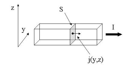 En la figura de arriba se aprecia el vector densidad de corriente cuya magnitud en este caso es j(y,z)es deciruna función de las coordenadas jyy z. S es el área de sección transversal que se ilustra cuadrada pero puede tener cualquier otra formausualmente es circular.