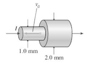 La figura muestra dos alambres conectadoshechos del mismo material. La corriente que entra desde la izquierda a la porción más delgada es de 2 A. Allí la velocidad de arrastre de los electrones de 8.2 x 10-4 m/s. Suponiendo que el valor de la corriente se mantiene constanteencontrar la velocidad de arrastre de los electrones en la porción de la derechaen m/s.