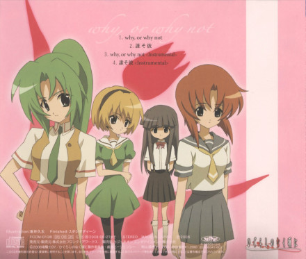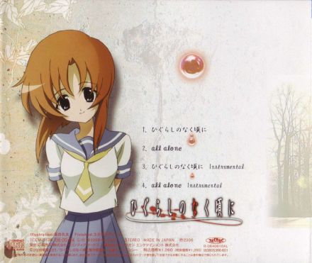 【专辑名】OP主题歌《ひぐらしのなく顷に》 [4] 【发售日】2006年5月24日 【歌】岛宫荣子 【收录曲】 01. ひぐらしのなく顷に 作词:岛宫荣子,作曲:中泽伴行,编曲:中泽伴行、高濑一矢 02. all alone 作词:岛宫荣子 作·编曲:高濑一矢 03. ひぐらしのなく顷に(Instrumental) 04. all alone(Instrumental) | |