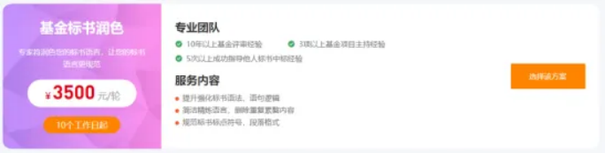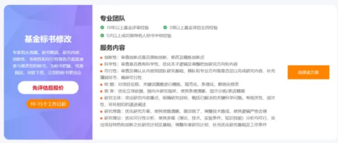 共有 4 类服务,你可以根据自己的需求,选择不同服务,包括:基金标书修改、基金标书润色、基金标书评估、基金标书指导,最快 5-7 天即可修改并返回国自然标书,为你的标书保驾护航!提升中标概率!