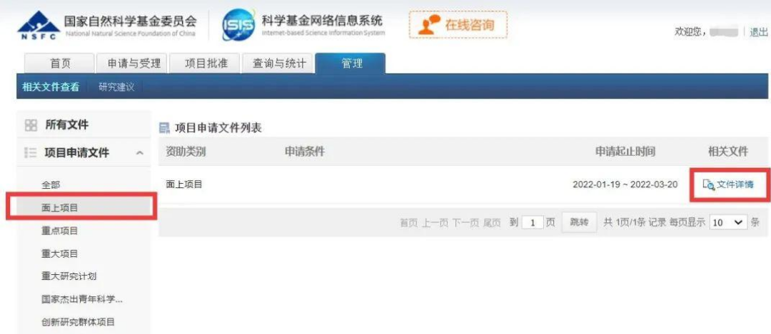 注意上图中最左侧是项目类型,最右侧有“文件详情”。我们在最左侧点击“面上项目”,可得如下界面(注意:左侧部分的右下角有箭头,可以找其它的项目类型,比如青年项目和地区项目等):