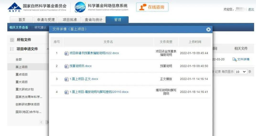 依次下载弹窗中出现的文件即可,完成。如果想下载其它类型的基金模版,如青年项目和地区项目,点击最左侧项目类型部分的右下角的箭头翻页即可找到。