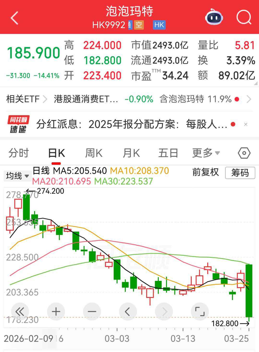 截止发稿,泡泡玛特股价放量下跌14.41%,击穿多条短期均线,市场对增长可持续性的担忧集中释放。业内人士透露,短期或仍面临估值与情绪双重调整压力。