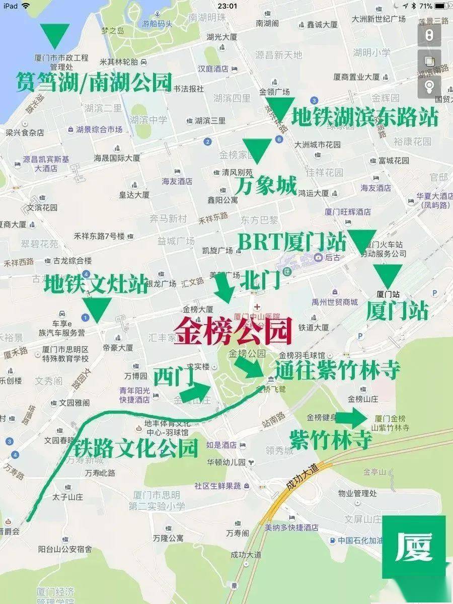 景点周边:观音寺入口绝对是厦门中北部最热闹的地方之一,隔壁就是厦门老牌商场SM城市广场,想吃想玩应有尽有。侨岳路入口离厦门文化艺术中心不远,那边有博物馆、图书馆、科技馆。西边连着狐尾山,狐尾山上有气象公园。