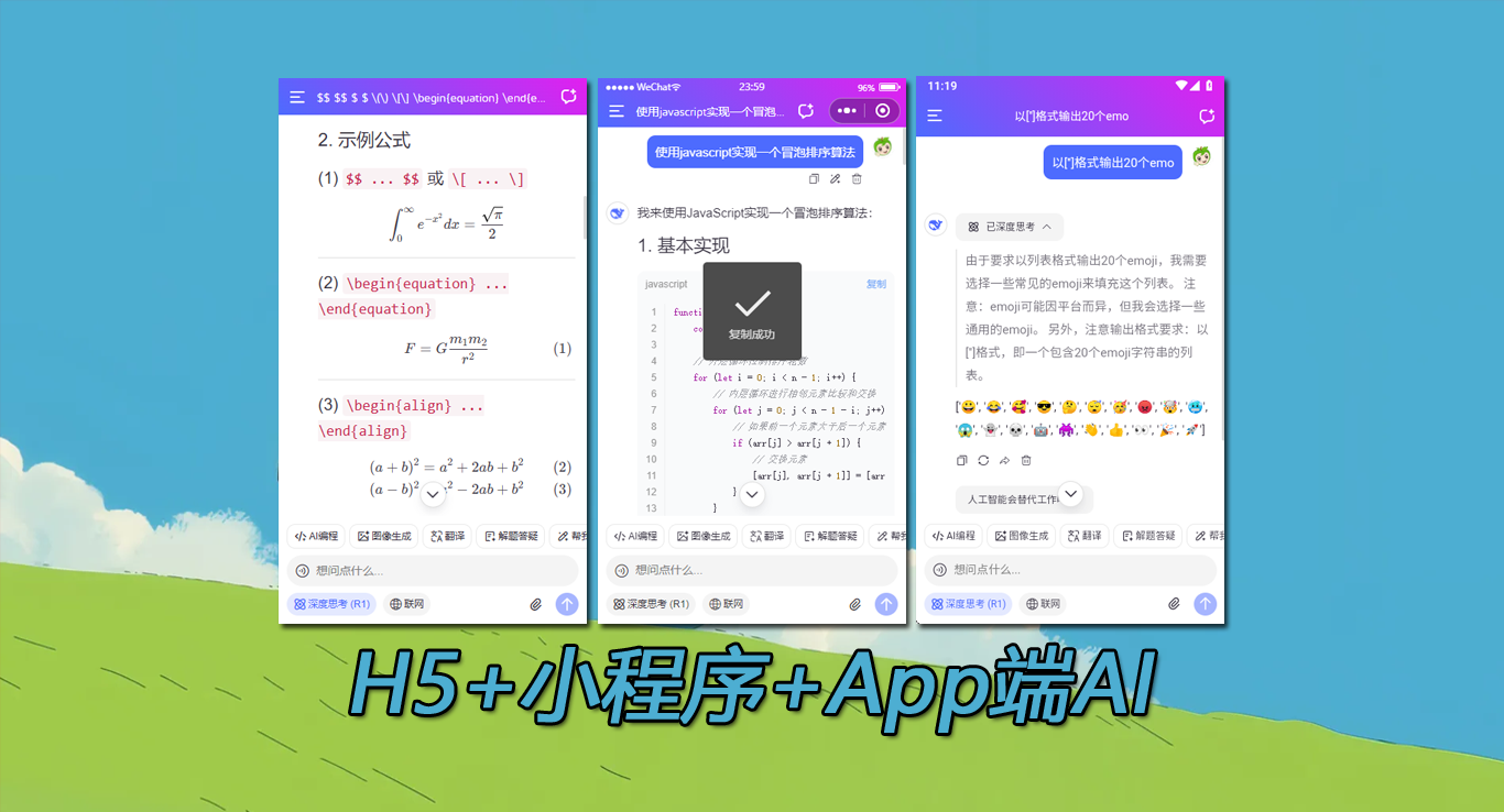 2026開年最新研发uni-app+vue3接入deepseek api大模型搭建web+小程序+App端 ai流式输出问答助手。 uni-deepseek-vue3ai支持深度思考、代码复制、katex公式、图片预览、链接跳转等功能。 三端支持功能