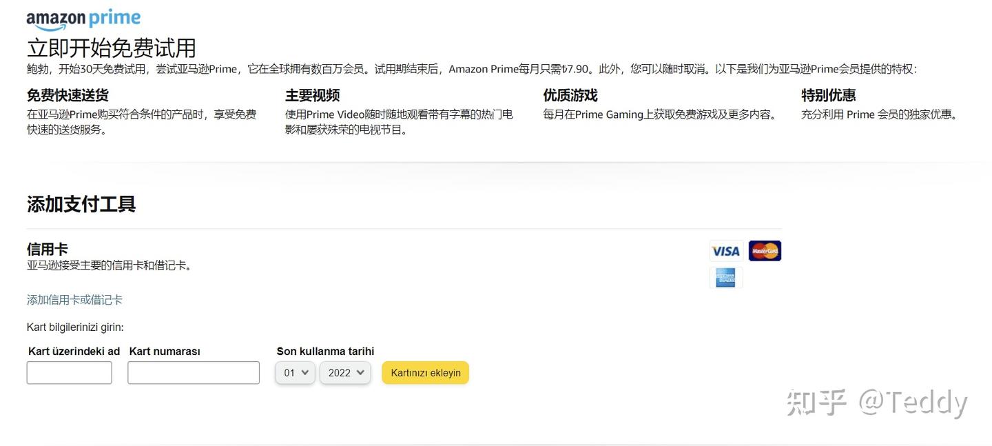 - 土耳其订阅为例。进入 亚马逊土耳其官网 ,点击网页右上角的按钮(如图) ,完成登录/注册。这一步注册的邮箱推荐使用Gmail,用自定义域名邮箱接验证码基本上都会直接报错。完成 登录 / 注册 后,点击我的 Prime 会员资格,并点击免费试用 30 天的按钮 Amazon Prime 30天的特权免费试用期后,每月只需 不到10块钱的会费。