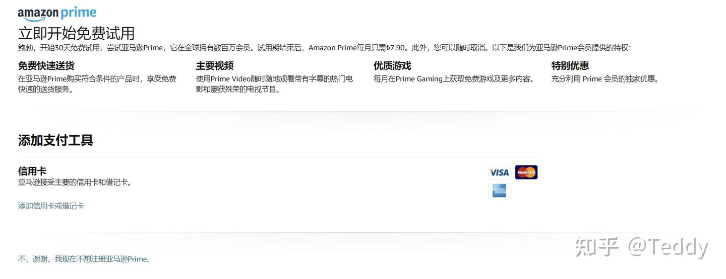 推荐使用 Gmail 邮箱接收验证码,否则容易显示系统出错。注册完成后点击 添加信用卡或借记卡,依次输入卡片上的姓名、卡号、有效期,然后点击黄色按钮完成订阅。P.S 亚马逊这些大厂由于安全度较高且风控严格,所以这一步无需输入CVV。