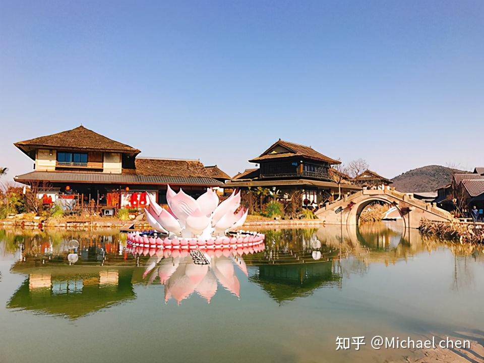 拈花湾位于无锡市滨湖区马山国家风景名胜区的山水之间,“拈花湾”的命名,一方面源于灵山会上佛祖拈花而迦叶微笑的经典故事拈花一笑,同时也缘于它所在的地块形似五叶莲花的神奇山水。小镇整体建筑风格与日本奈良非常相似,又融入了中国江南小镇特有的水系,打造出了一种独有的建筑风格。