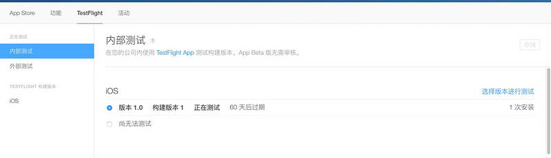 进入 itunesconnect 选择 APP,点击上方的 TestFlight 菜单,选择内部测试,然后点击右侧的选择版本进行测试选择一个你要的版本进行测试。![image]