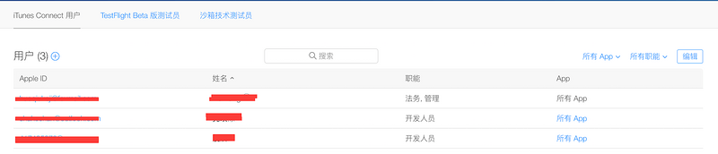 我们需要点击 iTunes Connect 用户菜单在这里添加用户,点击下方用户右侧的 + 号,添加用户(职能随便选择),被添加的用户会收到一份邮件,点击邮件里面的确认链接即可,添加完会在这里显示用户。