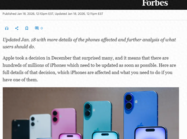 【环球网科技综合报道】据《福布斯》1月19日消息,苹果去年12月的一项决定引发广泛关注,目前全球数亿部iPhone需尽快完成系统升级。据悉,苹果已调整系统更新策略,iOS 18系列旧版系统仅对三款机型开放维护,其余机型需升级至iOS 26以保障安全。