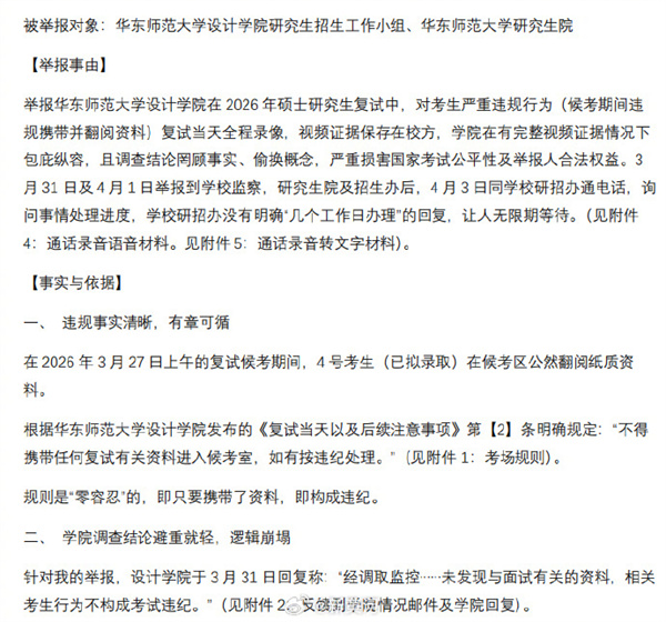 4月3日,华东师大研究生招生办公室正式回复。校方称,已成立专项调查工作小组,反复逐帧查看监控录像,确认4号考生携带的材料为“准考证、学历证书备案表、在校证明、身份证复印件等资格审核材料”。校方解释,该生因“系统操作原因未能上传全部复试资格审核材料”,经考前征得设计学院同意,于复试当天携带纸质材料进行现场核验。由于材料与复试专业内容无关,且系工作人员允许带入候考室,故认定不违反相关管理规定。sMB四川教育在线-四川教育讯息