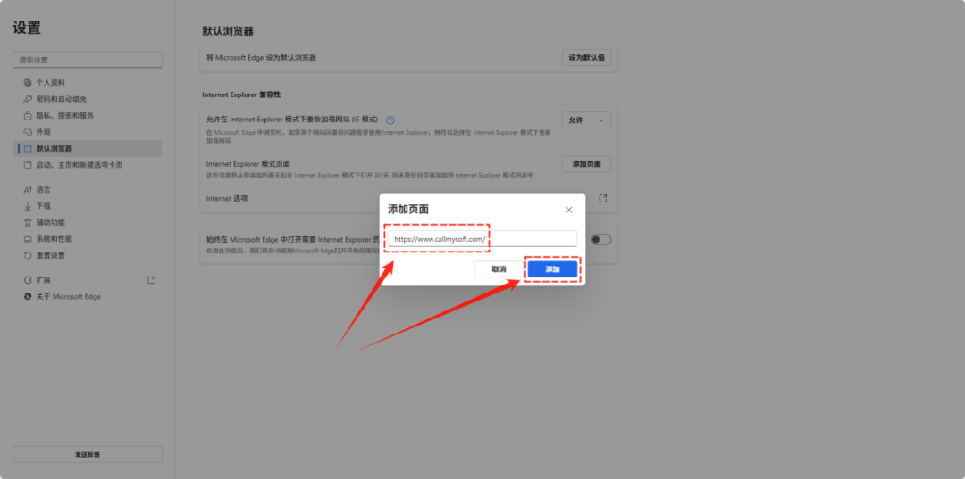 2.在【Internet Explorer模式页面】部分,点击【添加页面】按钮,在弹出的输入框里粘贴目标网站的完整地址(必须包含http://或https://);