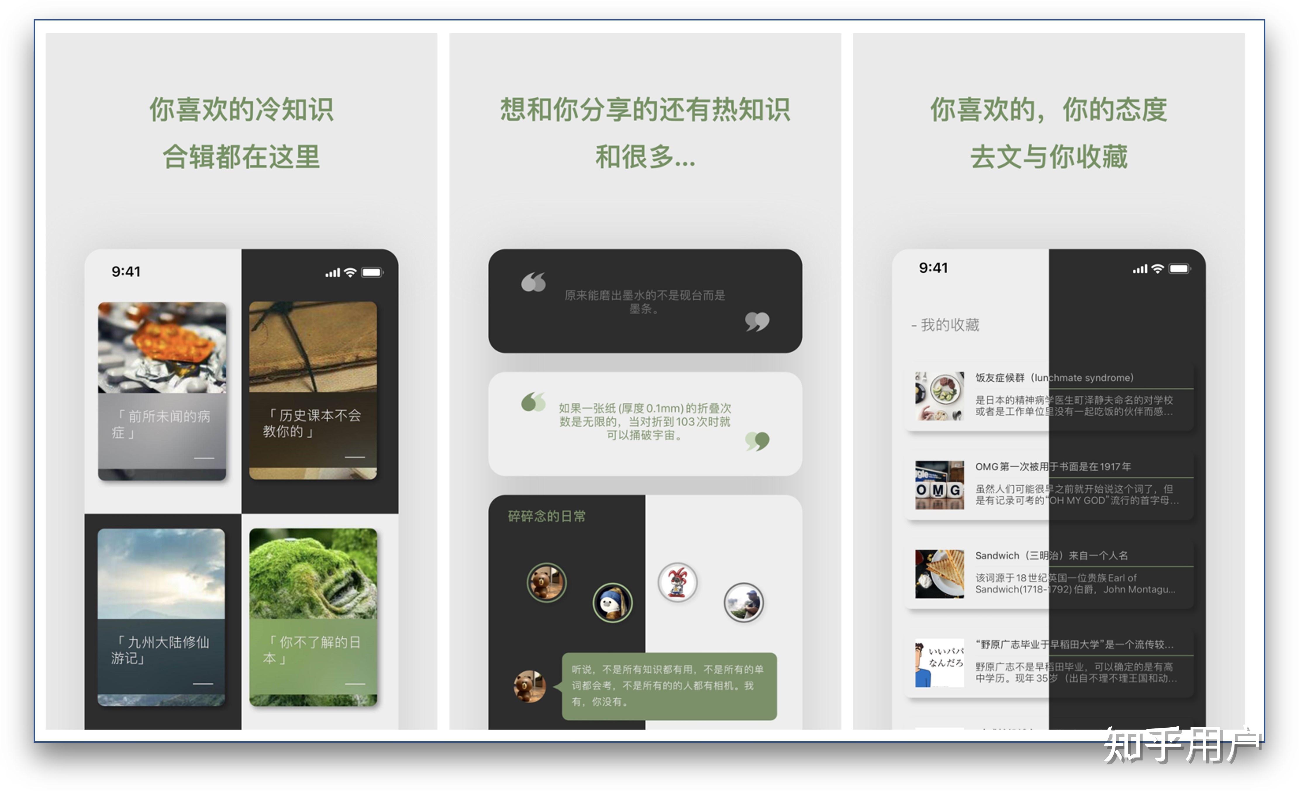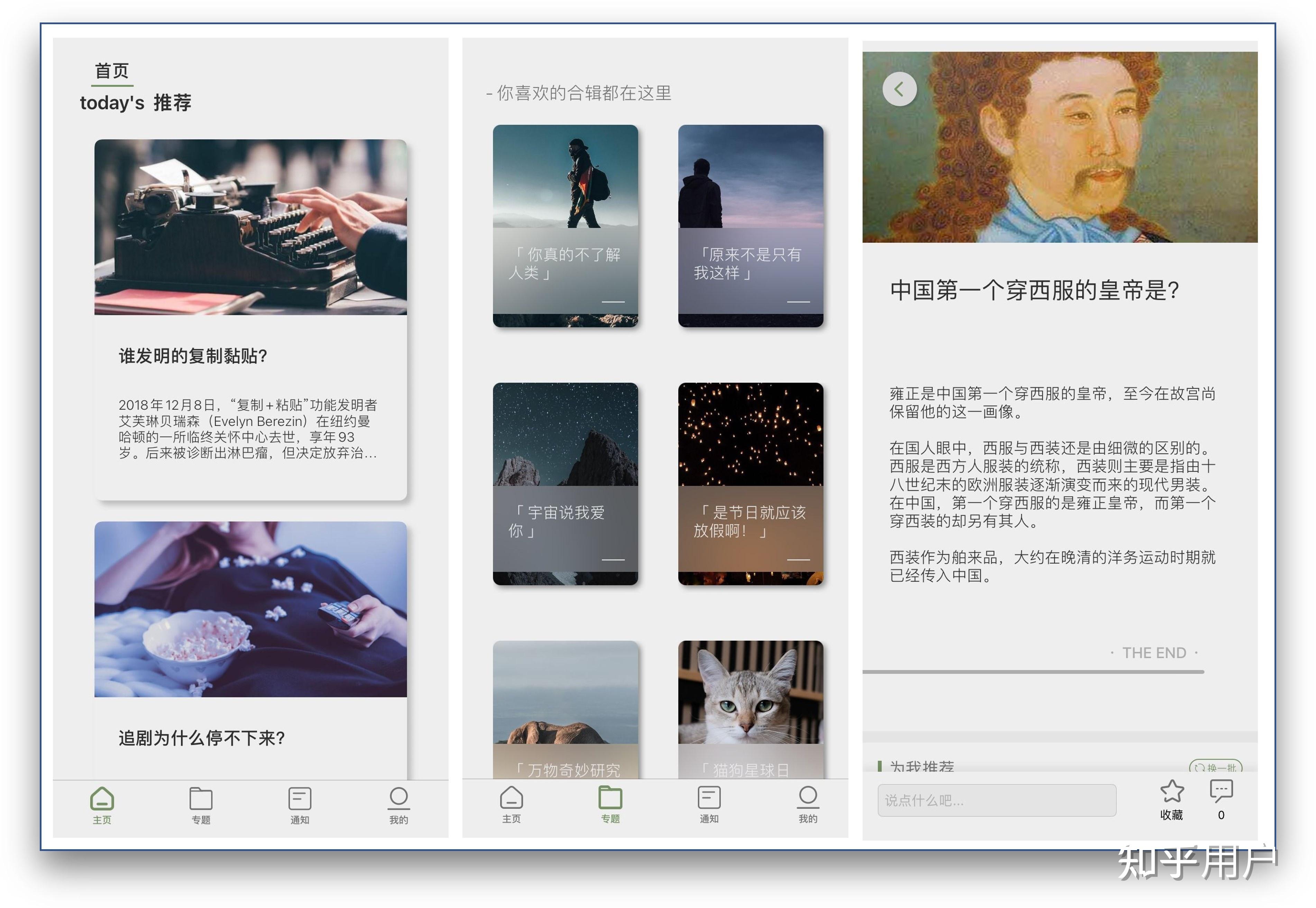 它的首页版块是推荐版块,卡片式布局展示,下拉就可以刷新展示新的内容,第二个版块是冷知识专题版块,也就是冷知识分类合辑版块,包括原来不是只有我这样、宇宙说我爱你、万物奇妙研究所、猫狗星球日记、互联网必备冲浪词典、历史课本不会教你的、程序员也想知道为什么、看起来没有用的 tips 、无用的知识 +1 、一本不存在的翻译词典等。