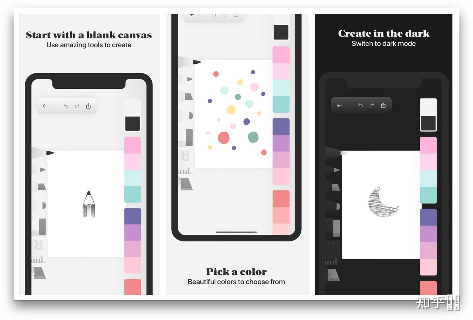 它支持 37 种颜色的调色板,你可以随意切换;它支持导出图片,支持分享给其他 App ,支持深色主题。