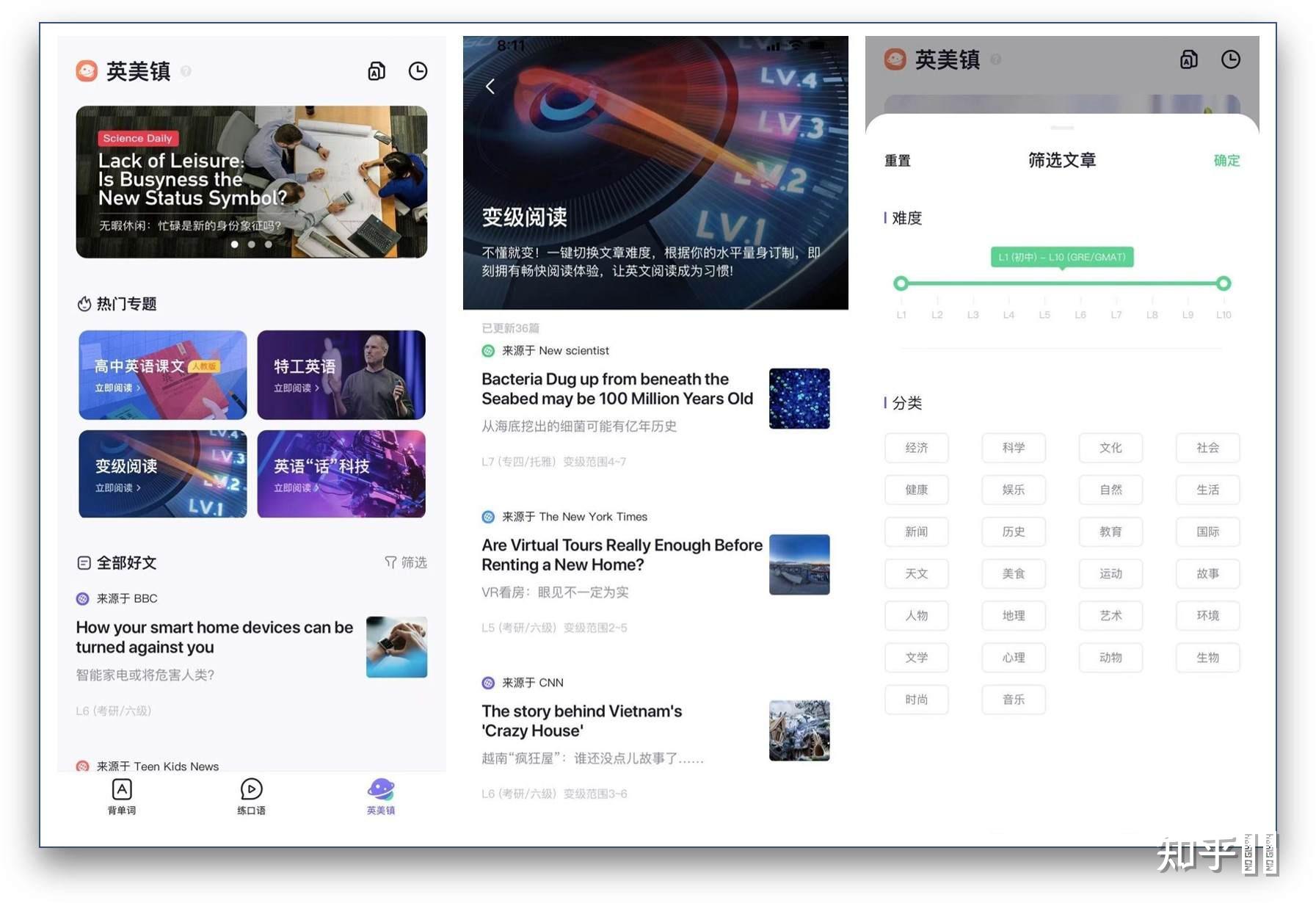 它提供了丰富的英语口语课程,包括:日常生活、商务求职、出国旅游、科技体育、中学教材、影音娱乐、时尚购物、校园生活等情景对话。