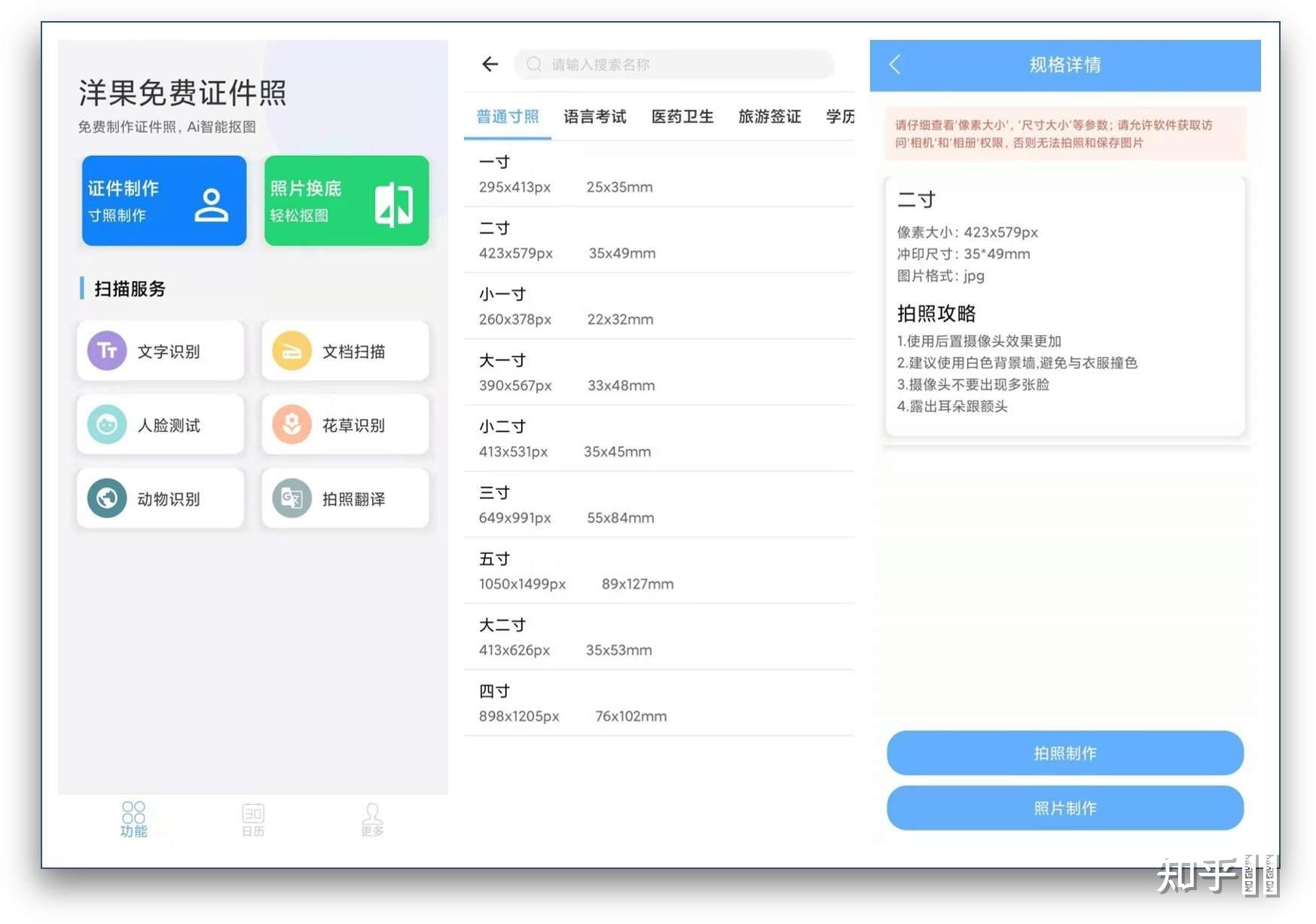 它的证件照制作提供了多尺寸证件照制作,包括一寸、二寸、小一寸、大一寸、小二寸、三寸、五寸、大二寸、四寸,还按照证件照使用场景进行分类,包括:语言考试、职业资格、财务考试、建筑工程、医药卫生、学历考试等。