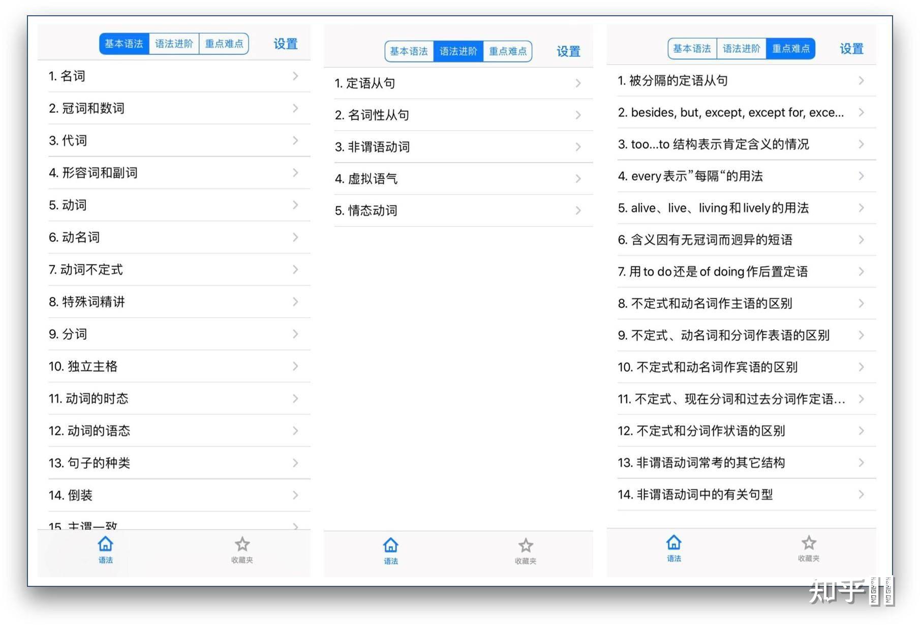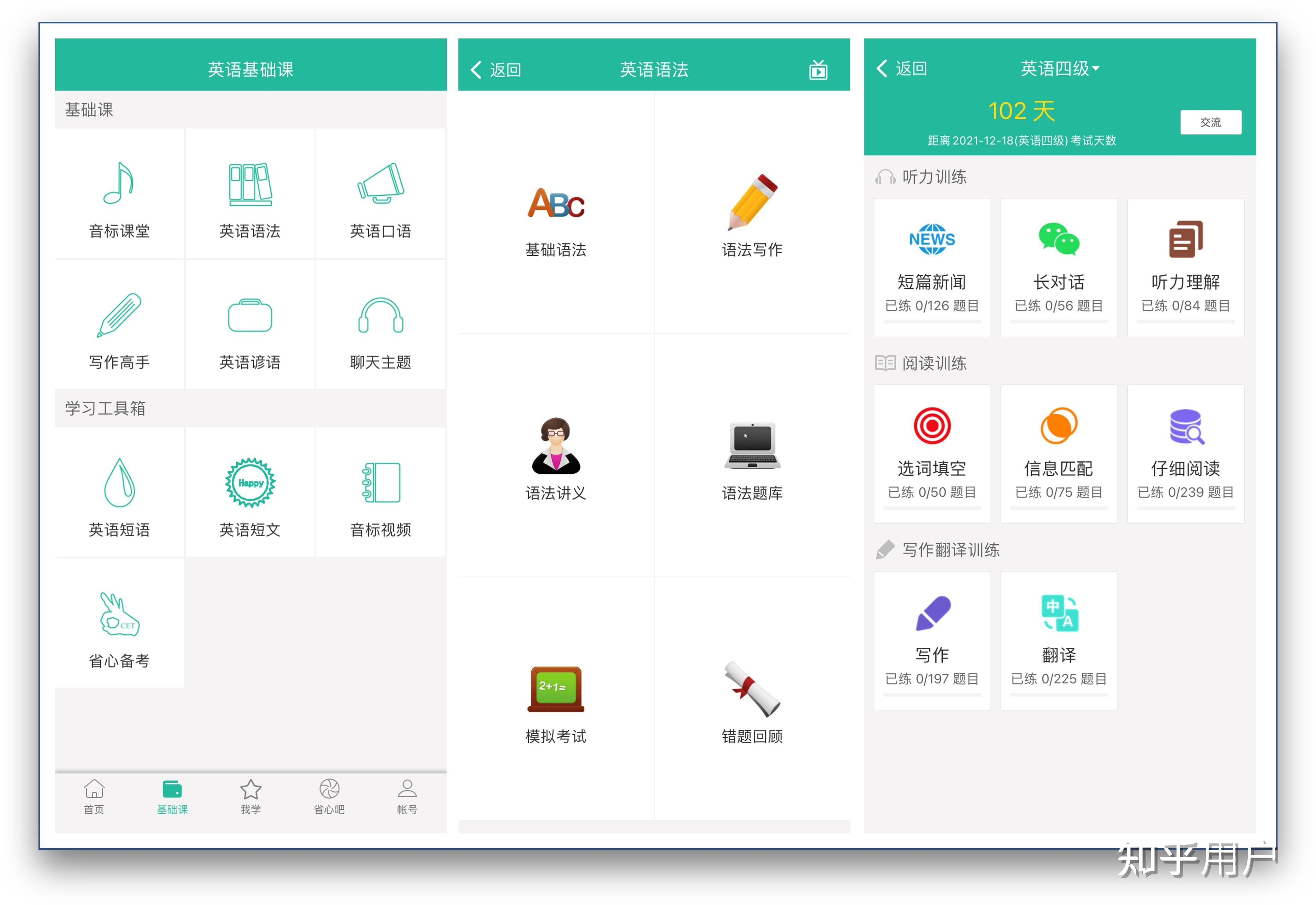 它支持实用的英语语法学习功能,包括:基础语法、语法写作、语法讲义、语法题库、模拟考试、错题回顾。