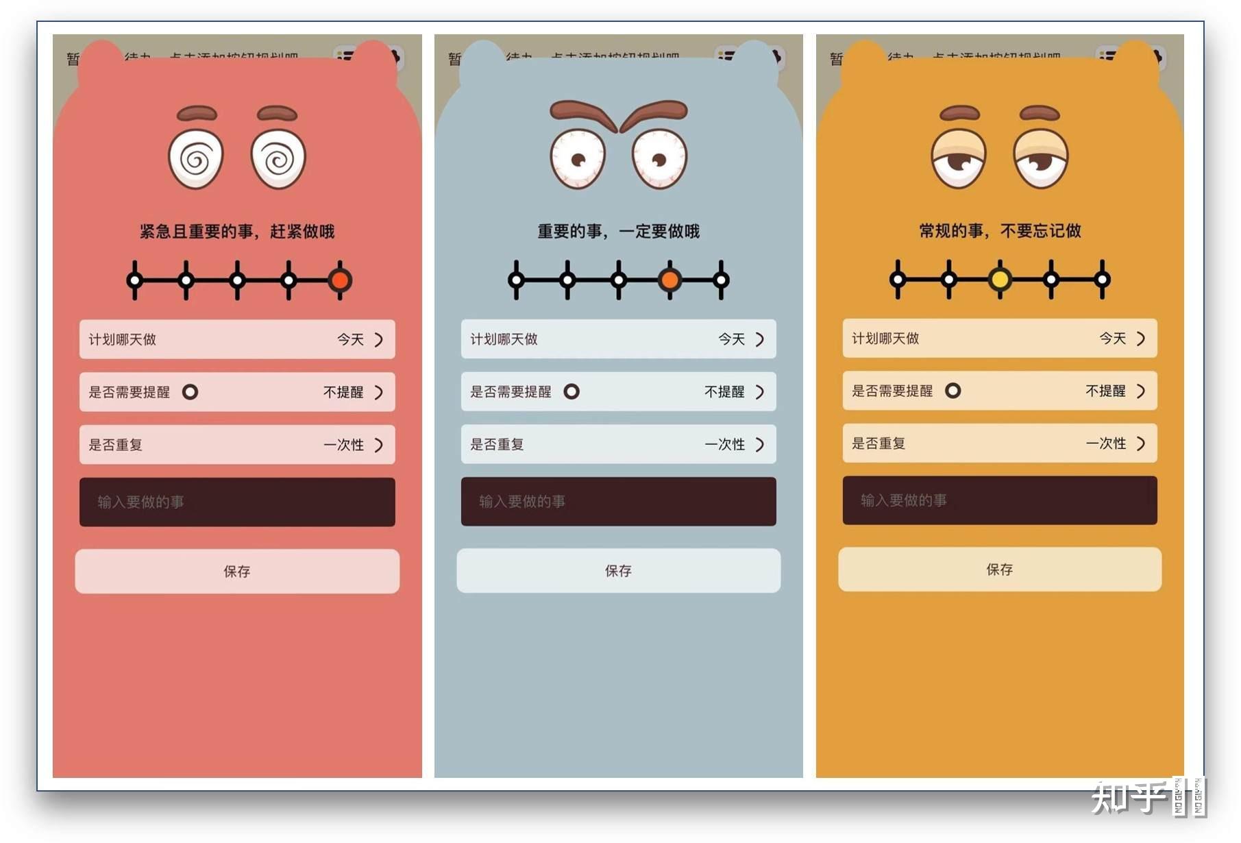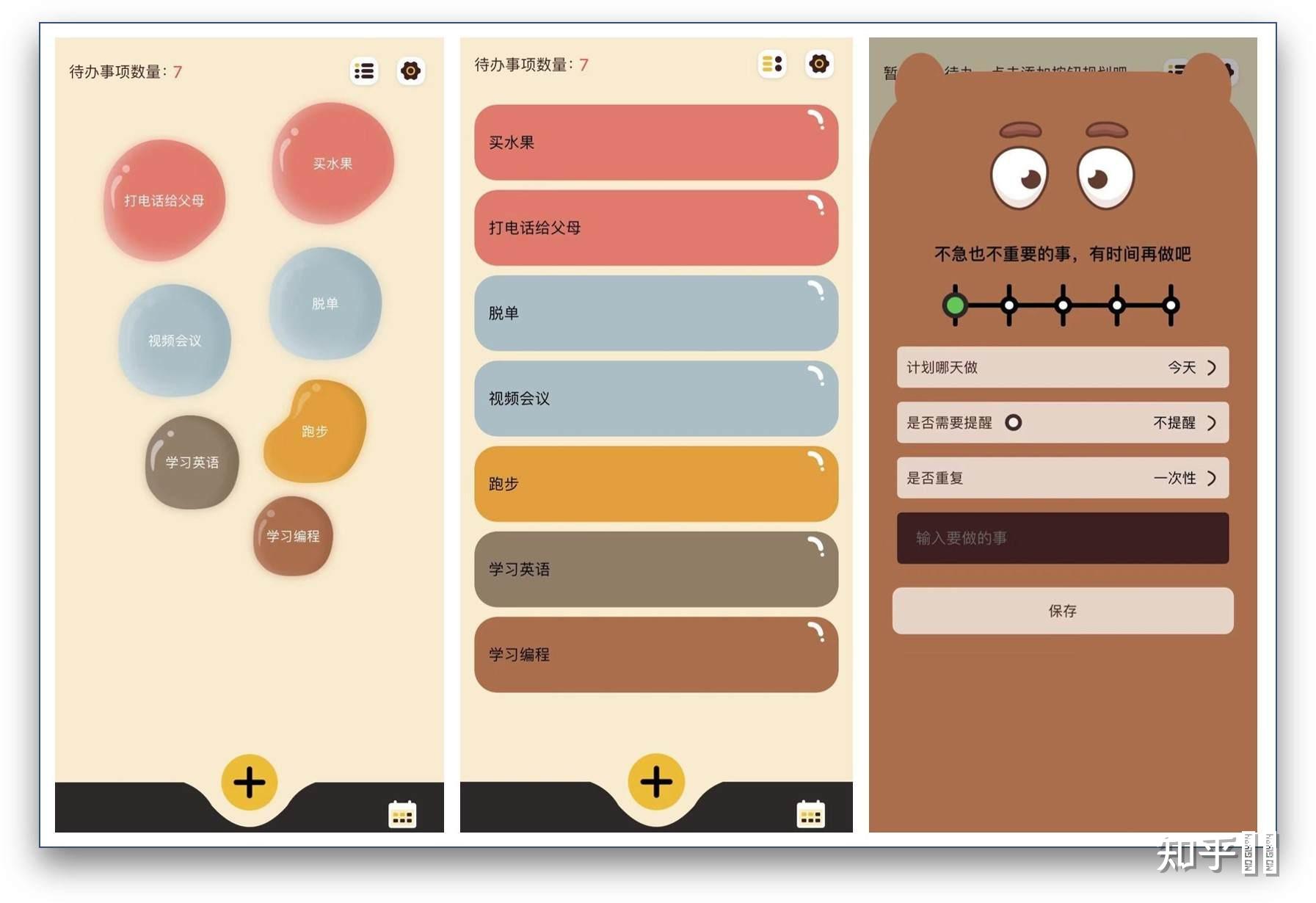 每添加一个待办事项,就会出现一个气泡,也就是说每个待办事项对应一个气泡;不同紧急程度的事项对应的气泡颜色也会不一样,紧急程度越高,气泡更大,位置也在更上面。