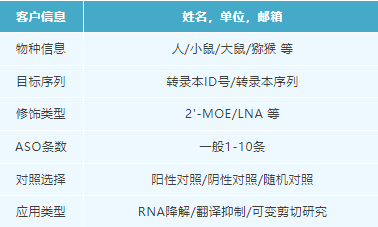 IDT提供专业的ASO序列设计,设计时会综合考虑ASO长度,GC含量,热力学特性,特异性,化学修饰等特征。如果要设计ASO探针,可提供如下信息,IDT会有专业的生信人员进行设计。