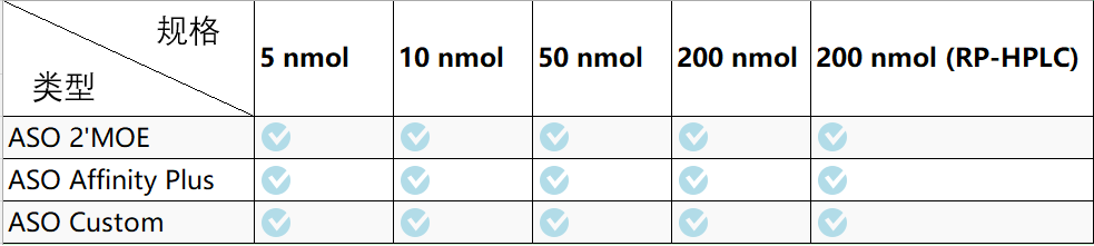 - 只支持"gapmer"的20nt设计,5’与3’末端分别有5nt 2'MOE修饰碱基,中间10nt为DNA,且全序列进行硫代磷酸酯修饰连接