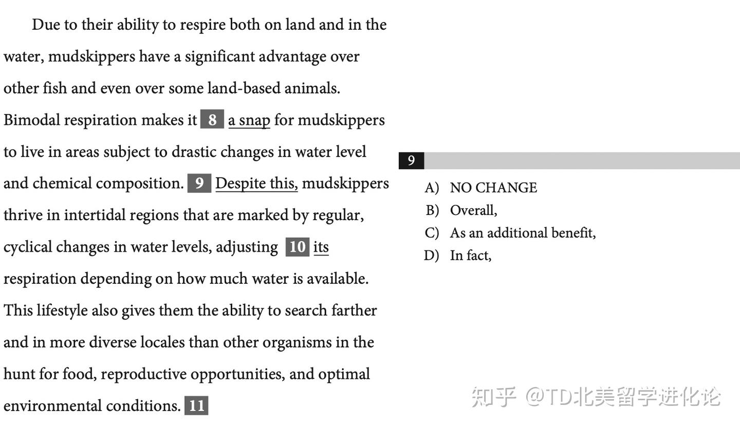 此处我们可以看到前一句讲的是mudskippers由于bimodal respiration可以在水位和化学构成具有剧烈变化的水域中生活。后一句讲的是mudskippers可以在有周期性、规律性水位变化的水域中茁壮地生活。可以很清楚地看到,第二句中的thrive茁壮生活是对前一句的程度递进,就是不仅可以在该水域中中生活(live),并且能生活地很好(thrive),是一个程度递进,此时选择in fact最为准确。