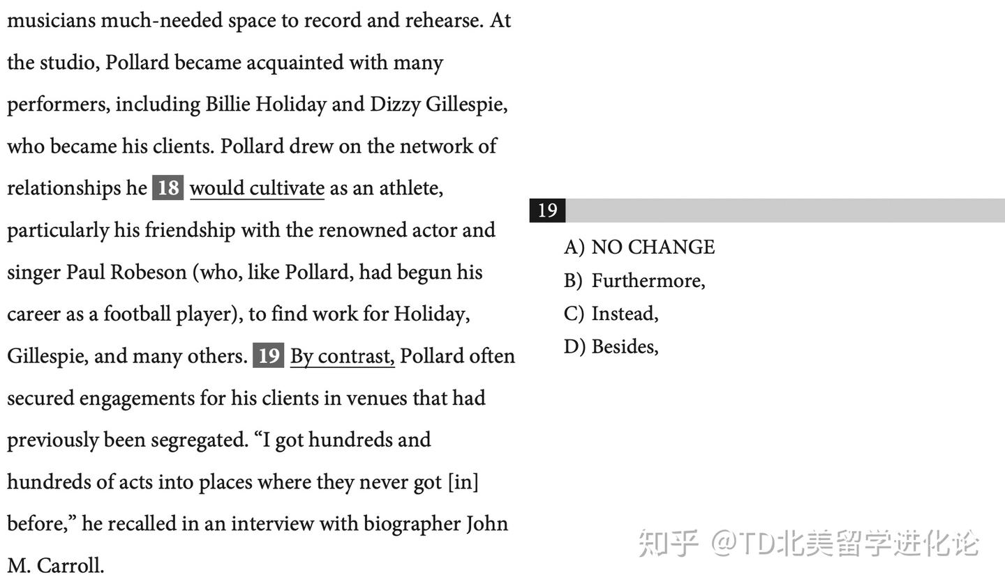 但是正如我们之前所分析的,besides表示的是普通的两者并列,而此处第二句的意思为不仅仅能够为人找到工作,并且是在之前被种族隔离的地点找到工作,也就是说是对“找工作”这一件事情的进一步说明,因此是一个程度递进。此题如果选besides的话,那么后面应该讲一个和找工作不同的内容,比如Pollard不仅仅给clients找工作,还为clients找相亲对象。
