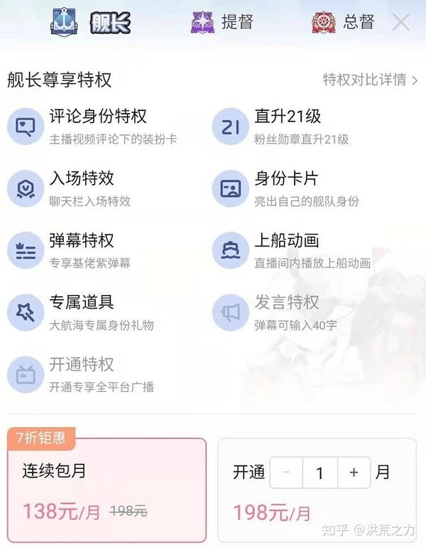 第一块收入叫 “ 大航海”,也就是开通粉丝特权,舰长包月是138元、提督1998元、总督19998元。